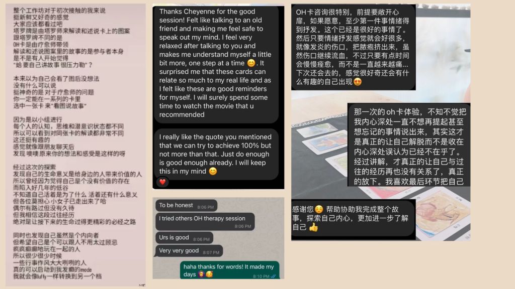 Thanks Cheyenne for the good session! Felt like talking to an old friend and making me feel safe to speak out my mind. I feel very relaxed after talking to you and makes me understand myself a little bit more, one step at a time